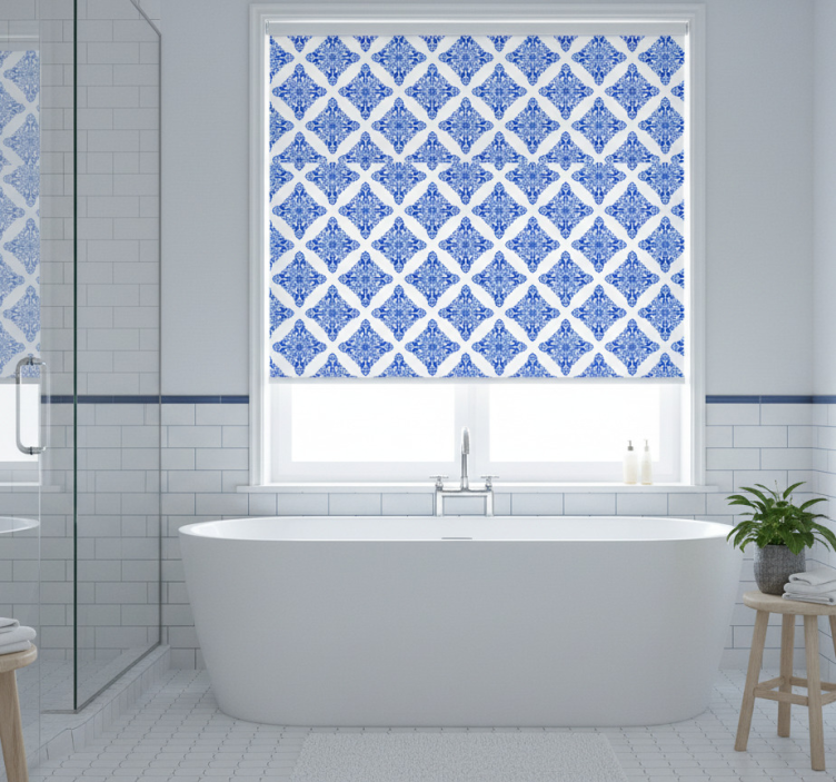 Blue roller blind in patterned blue