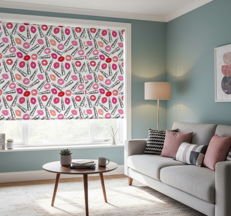 Reference: E7657Introducing our stunning Modern roller blind lipstick and lips design, a vibrant and eye-catching addition to any space! This unique design features a delightful blend of bold lipstick shades and playful lips motifs, creating an atmosphere that is both chic and lively. Crafted with care, this roller blind not only enhances your room's aesthetic but also offers practical benefits such as easy assembly, easy cleaning, and effective sunlight protection.