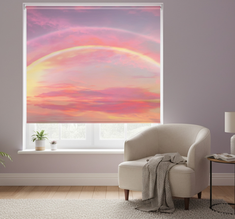 Pink roller blind in a pink sky with rainbow