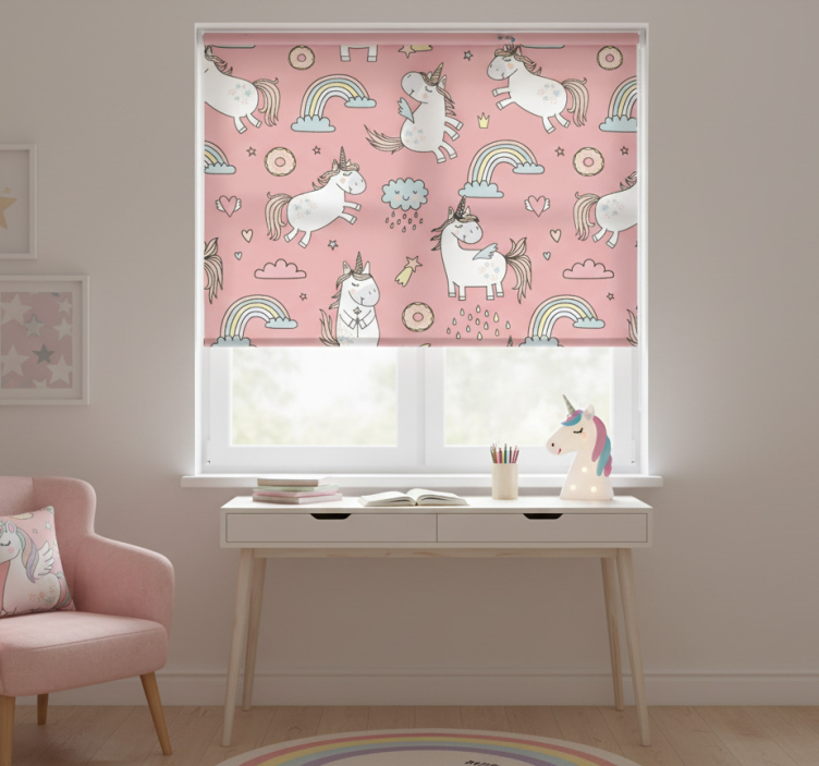 Reference: E8187Transform your space with the enchanting Pink roller blind magical unicorn joy. This delightful design features whimsical unicorns dancing among fluffy clouds and shimmering stars, all set against a soft pink background. Perfect for creating a joyful atmosphere, this roller blind adds a touch of magic and whimsy to any room.