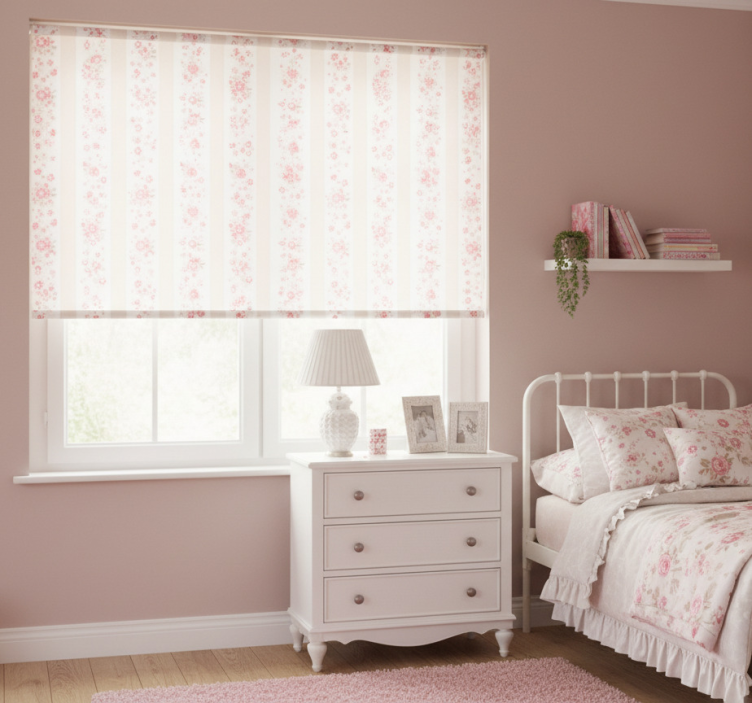 Reference: E8191Introducing the Pink Roller Blind with Retro Floral Stripes