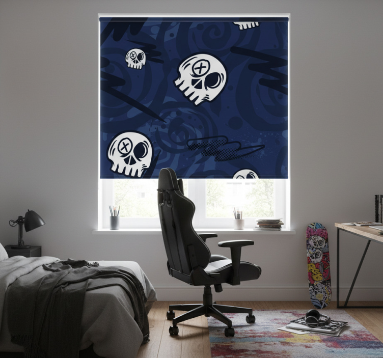 The Teenage roller blind graffiti skulls design teenage roller blind is the perfect choice for creating a unique and inspiring atmosphere in any room. Its striking design is ideal for teenagers looking to express their individuality and creativity. Whether for a bedroom, study area, or gaming room, this roller blind adds a touch of personality and flair, making it a fantastic decorative element that sparks joy and excitement!