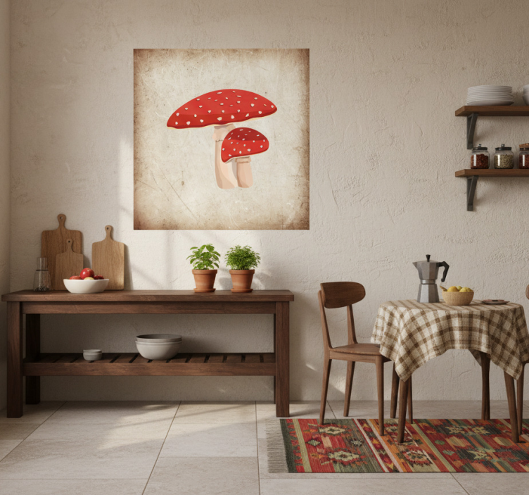 Reference: G610Bring a touch of nature into your home with our Kitchen poster amanita mushroom illustration. This stunning design features a beautiful representation of amanita mushrooms, crafted with high colour intensity on a semi-matt finish that eliminates reflections. The 180g/m2 grammage makes it perfect for posters, ensuring durability while enhancing the visual appeal of your kitchen decor.
