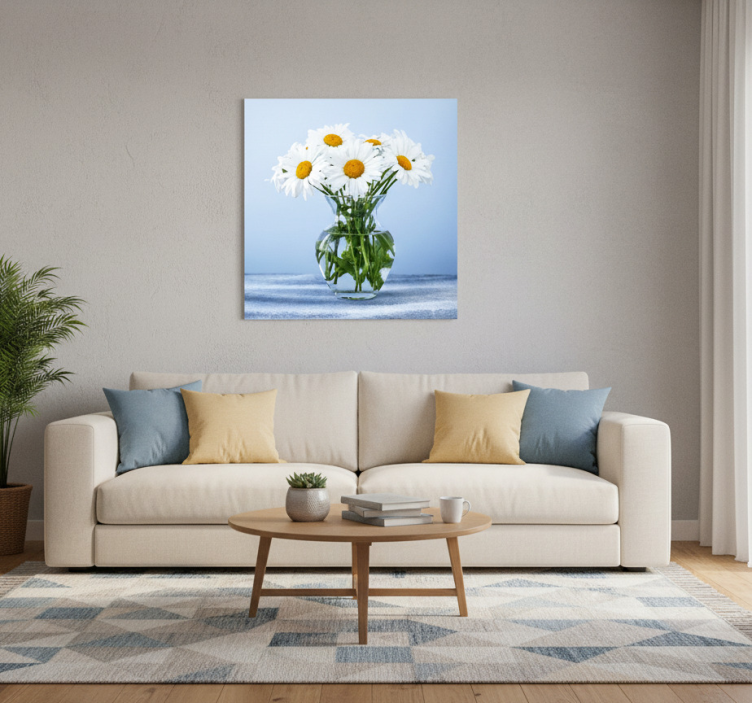 The Living room poster daisy flowers in glass pots living room poster is the perfect choice for those looking to elevate their home decor. This poster inspires joy and warmth, making your living area feel inviting and cheerful. Imagine brightening up your walls with this beautiful design, creating a focal point that sparks conversation and admiration. Transform your living space into a delightful haven filled with nature's beauty!