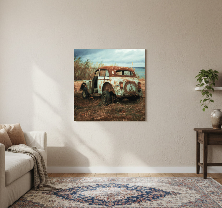 Reference: G801Transform your space with our stunning Living room poster of an old dirty car in the fields. This unique design captures the rustic charm of an aged vehicle set against a serene backdrop of lush fields. Featuring a 180g/m2 grammage for durability and a semi-matt finish without reflections, this poster boasts high colour intensity that breathes life into any room!