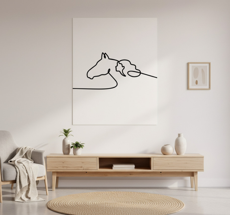 Reference: G895Introducing our stunning Living room poster woman with horses line art, a captivating blend of elegance and artistry! This beautiful design showcases a graceful woman intertwined with majestic horses, all rendered in a minimalist line art style. Featuring a 180g/m2 grammage, this poster is perfect for showcasing high color intensity with a semi-matt finish that avoids reflections, ensuring the artwork shines in any setting.