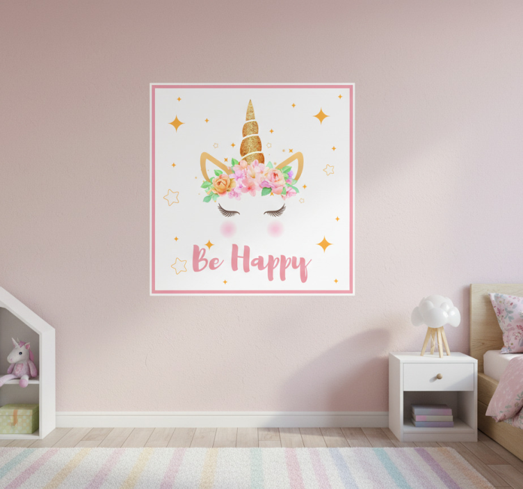 Reference: G902Introducing our delightful Nursery poster unicorn with phrase be happy, a charming addition to any child's room! This enchanting design features a whimsical unicorn surrounded by vibrant colors and playful elements, all crafted on a high-quality 180g/m2 paper with a semi-matt finish that ensures no reflections. The high color intensity brings the artwork to life, sparking joy and imagination in your little one's space.
