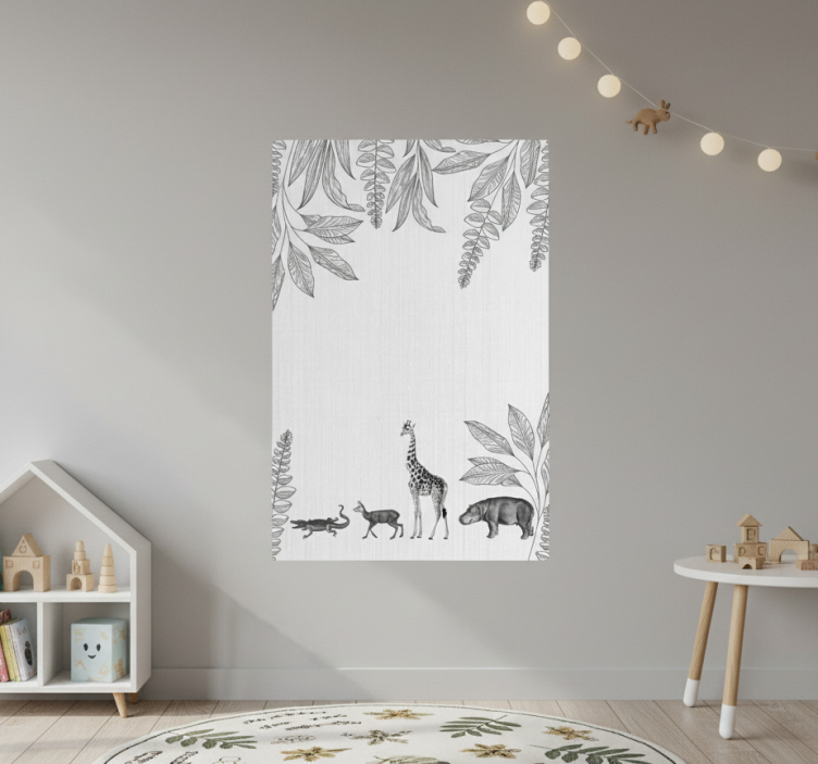 Reference: G941Introducing our delightful Nursery poster with safari animals and trees border, a vibrant addition to any child's room! This enchanting design features adorable safari animals playfully surrounded by lush trees, captivating your little one’s imagination. The poster is printed on quality 180g/m2 paper, ensuring durability, with a semi-matt finish that minimizes reflections while enhancing high color intensity, bringing the jungle to life!