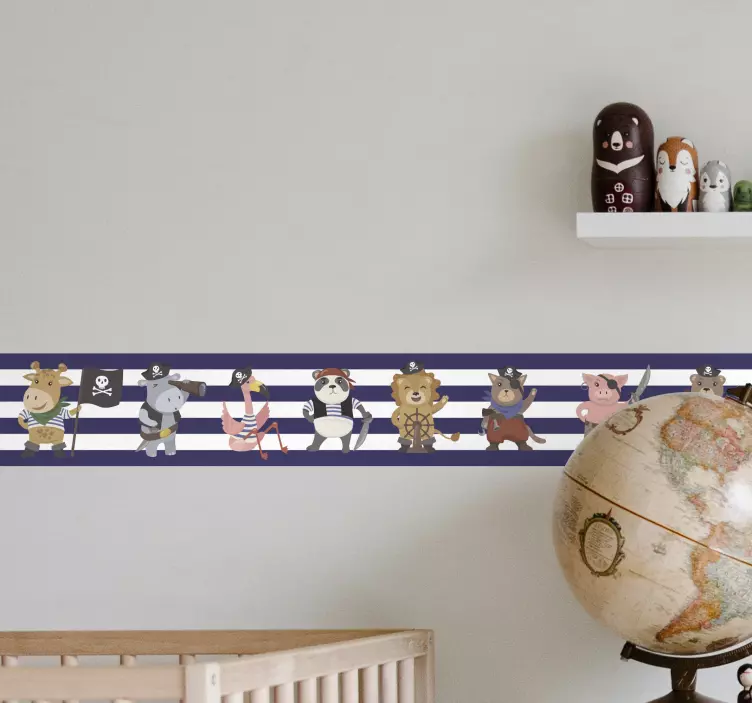 Transform your child's room with this beautiful vinyl sticker featuring different pirate illustrations. This is the perfect way to add some fun and excitement to their space. Create a lovely border on the wall with this animal pirates illustration border sticker. It's incredibly easy to apply and can be removed without damaging the wall. Choose from a range of sizes to find the perfect fit for your space.