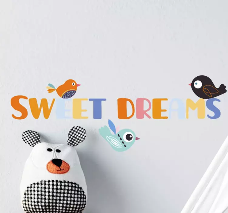 The Colorful nighttime phrase headboard wall sticker is a delightful addition to any child's room, featuring a playful design that includes charming birds, whimsical text, and multicolor illustrations. The sweet dreams are beautifully captured in colorful letters, creating an enchanting atmosphere that is both child-friendly and visually captivating. This vibrant artwork makes bedtime a magical experience, inspiring joy and comfort.