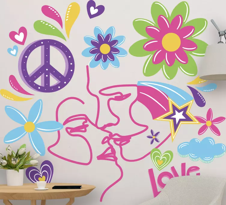 Transform your space with our Decoration wall sticker peaceful flower hearts. This vibrant design features playful line art of flowers and hearts, embodying urban peace and love. The colorful face elements bring a romantic touch to any room, creating an atmosphere that radiates positivity and joy!