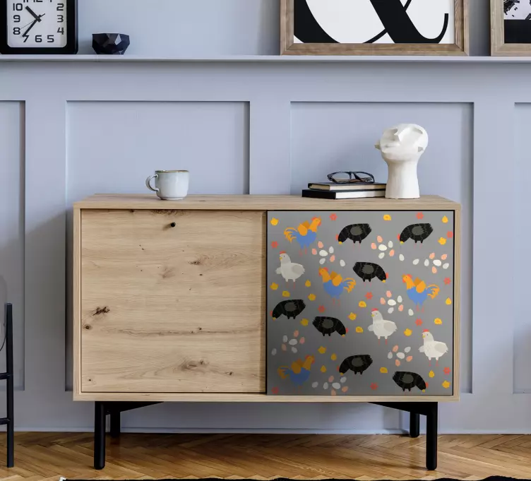 Reference: A52348A vibrant composition featuring various farm animals, including colorful chickens and black hens, scattered over a light background. This playful design brings an upbeat atmosphere, perfect for adding charm to any space.