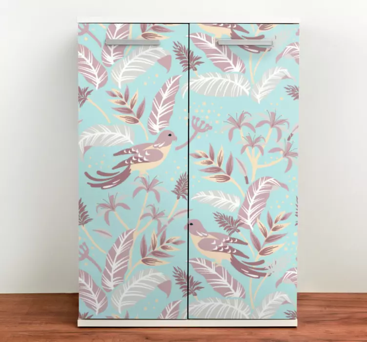 Transform your space with our stunning Furniture sticker botanical bird design, featuring an enchanting array of birds and parrots surrounded by vibrant leaves and exquisite flora. This exotic and tropical design showcases a captivating pattern in soft pastel colors, creating a harmonious blend of nature that brings the beauty of fauna into your home. Perfect for adding a decorative touch to any furniture piece, this decorative sticker is a celebration of life and color!