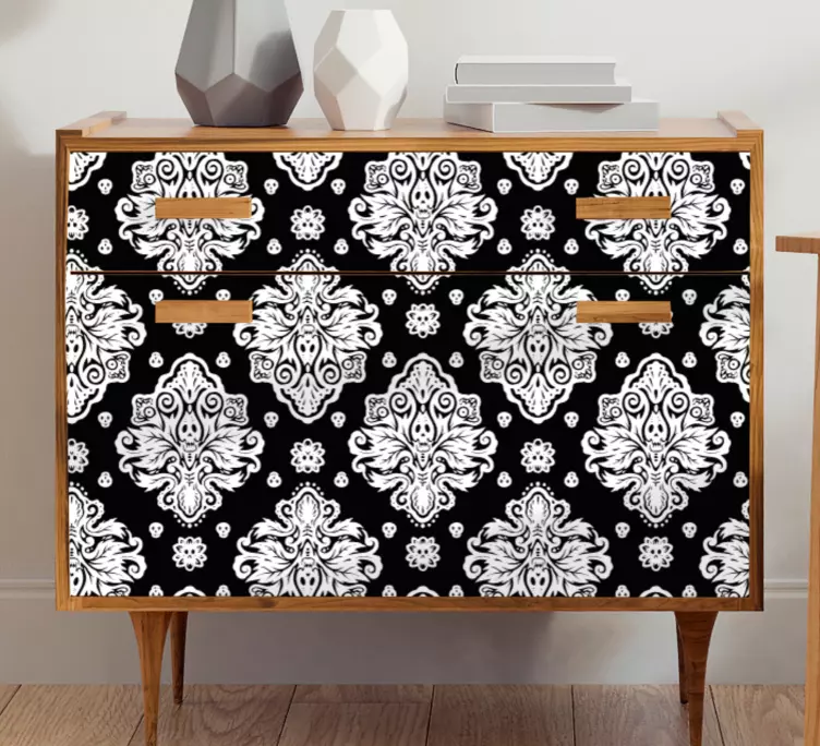 Introducing our stunning Furniture sticker elegant pattern design, a beautiful blend of skulls and florals intricately woven into a damask style. This ornate black and white pattern adds a touch of modern style to your furniture design and home interior, creating a unique atmosphere that is both striking and sophisticated. Perfect for anyone looking to elevate their space!