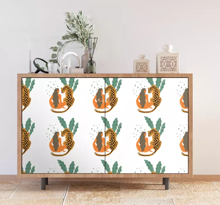 Transform your space with our Furniture sticker leopard plant scene, featuring a whimsical design that brings nature indoors! This stunning piece showcases a graceful woman surrounded by playful leopards and lush tropical plants, all hand-drawn to evoke a sense of serenity and adventure. The enchanting animal motifs create a captivating atmosphere, perfect for any furniture setting, whether it be in a cozy reading nook or a vibrant living area!
