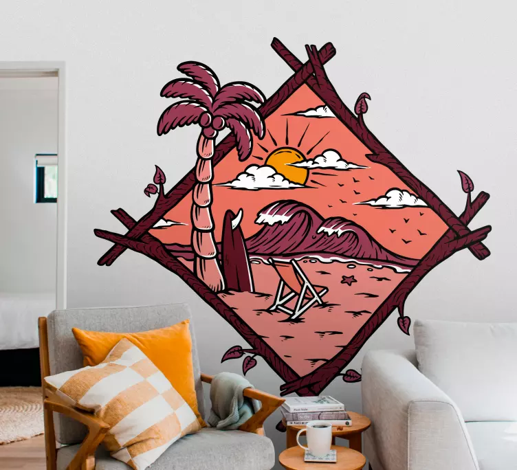 Transform your space with our Nature wall sticker tropical beach scene, a vibrant depiction of a lonely surfer riding the waves at sunset, surrounded by palm trees and mountains. This artistic drawing captures the essence of relaxation, inviting you to unwind in a tropical atmosphere from the comfort of your home. Imagine a serene beach chair overlooking a stunning sunset, where every glance brings a moment of peace and tranquility!