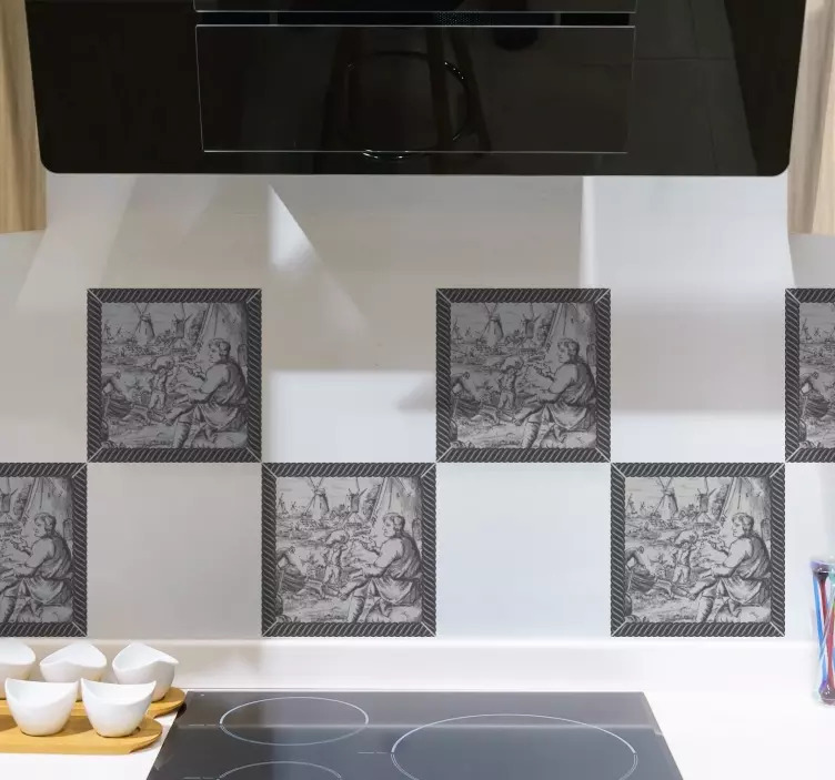 Introducing our stunning Tile sticker historic scene designs, a beautiful blend of artistry and craftsmanship that transforms your space! Featuring intricate patterns of men working in historic mills, these black and white tiles evoke a sense of cultural heritage and artistic elegance. Perfect for adding a unique landscape to any room, they embody the charm of traditional craftsmanship!