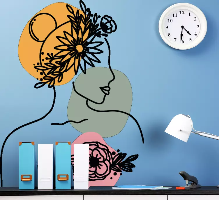 Transform your space with our Wall sticker elegant female silhouette, featuring a stunning design that beautifully captures a woman's face in an elegant lineart style. This abstract portrait is adorned with delicate flowers, creating a floral and minimalist aesthetic that effortlessly enhances any room. Ideal for those who appreciate art and beauty, this wall sticker adds a touch of sophistication to your decor!