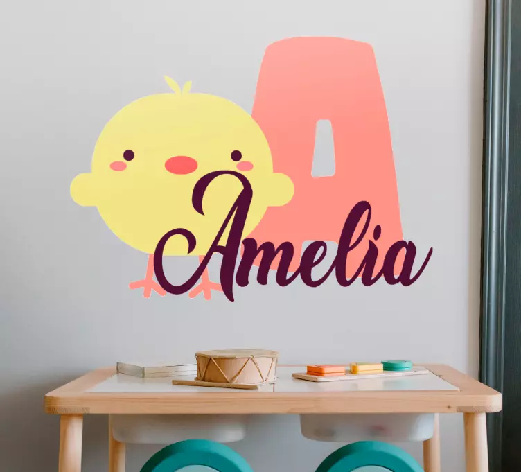 Transform your child's room with our Wall sticker for kid cute chick design, featuring an adorable cartoon chick that brings a burst of color and playfulness! This delightful design showcases a charming bird alongside a customizable initial and name, making it a truly personalizable piece of children's decor. Perfect for any kids' room, this vibrant wall sticker is not just a decoration; it’s a joyful statement that sparks imagination!