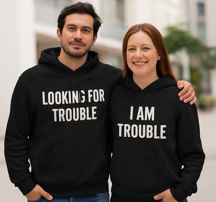 When it comes to expressing your love and unique style, our Couple t-shirts looking for trouble are the perfect choice! These playful couple t-shirts not only bring joy and laughter to your relationship but also serve as a fun way to stand out in any crowd. Wearing these together can spark conversations and create lasting memories, making them a must-have addition to your wardrobe!