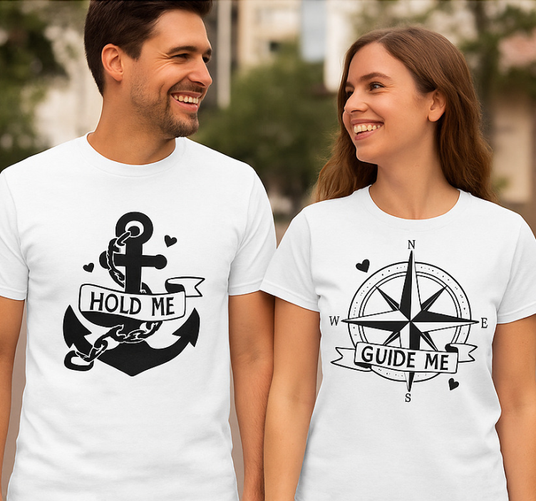 To keep your Hold me guide me couple t-shirts looking fresh and vibrant, simply machine wash them at 30 degrees. For best results, we recommend ironing them inside out or using a barrier cloth over the design. Enjoy wearing these t-shirts for many adventures to come!
