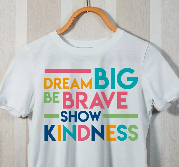 Introducing the Inspire with kindness t-shirt, a vibrant celebration of positivity and motivation! This t-shirt features a colorful design that beautifully intertwines uplifting quotes with a youthful spirit. The artwork combines elements of dreams and bravery, showcasing a kind message that encourages everyone to show their true selves. With its multicolor palette and motivational text, this t-shirt is perfect for anyone looking to spread kindness wherever they go!