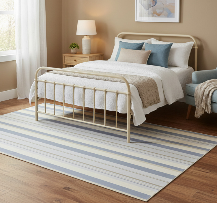 Reference: R21834Transform your space with the vibrant charm of our 80's blue and beige stripes bedroom vinyl rug. This stunning piece features a unique blend of retro patterns that effortlessly elevate the aesthetic of any bedroom. With its eye-catching blue and beige stripes, this rug not only adds a pop of color but also creates a cozy atmosphere, perfect for relaxation.