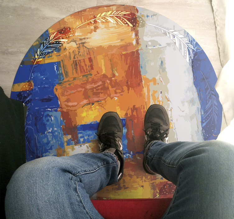 Transform your space with the stunning Abstract Color Fusion minimalist vinyl rug, a captivating piece that merges art and functionality. This unique design features an exquisite blend of abstract patterns, vibrant feathers, and a harmonious fusion of blue, orange, and yellow tones that create a dynamic texture, making it a striking addition to any room!