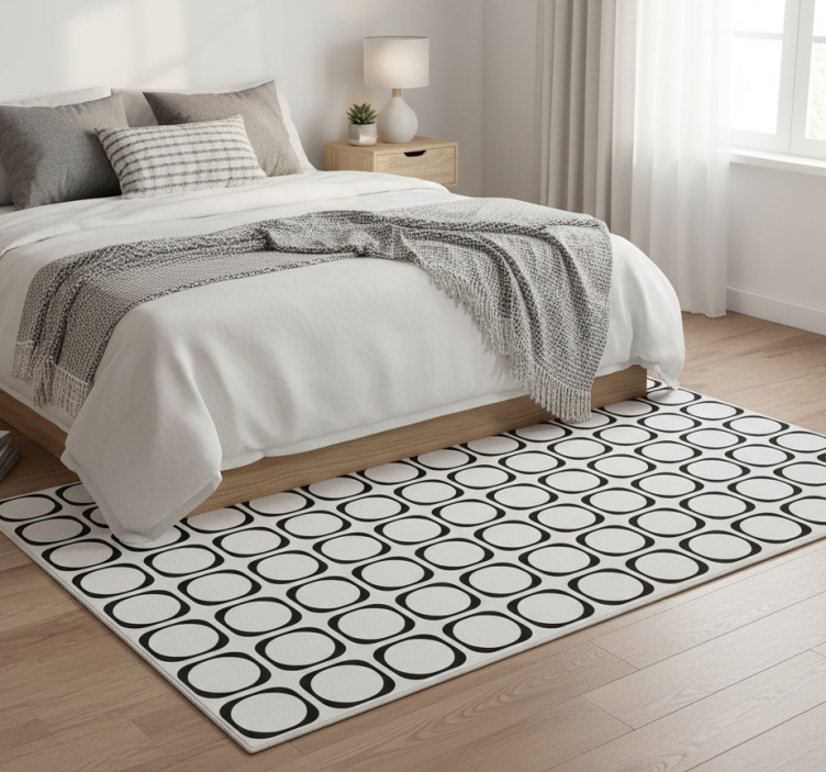 The Bedroom vinyl rug in black and white tiles bedroom vinyl rug is the ideal choice for those looking to add a touch of elegance to their décor. Its modern design complements various interior styles, creating a chic ambiance that inspires relaxation and comfort. By incorporating this rug, you’ll elevate your bedroom’s visual appeal while enjoying the warmth and coziness it brings!