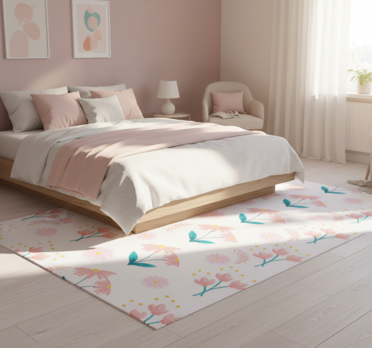 Enhance your living space with the enchanting Bedroom vinyl rug with minimalistic pastel flowers and dots bedroom vinyl rug. This delightful piece not only adds a touch of elegance but also serves as a beautiful focal point in your bedroom. Its artistic design inspires tranquility, making it a must-have for anyone looking to elevate their home decor!