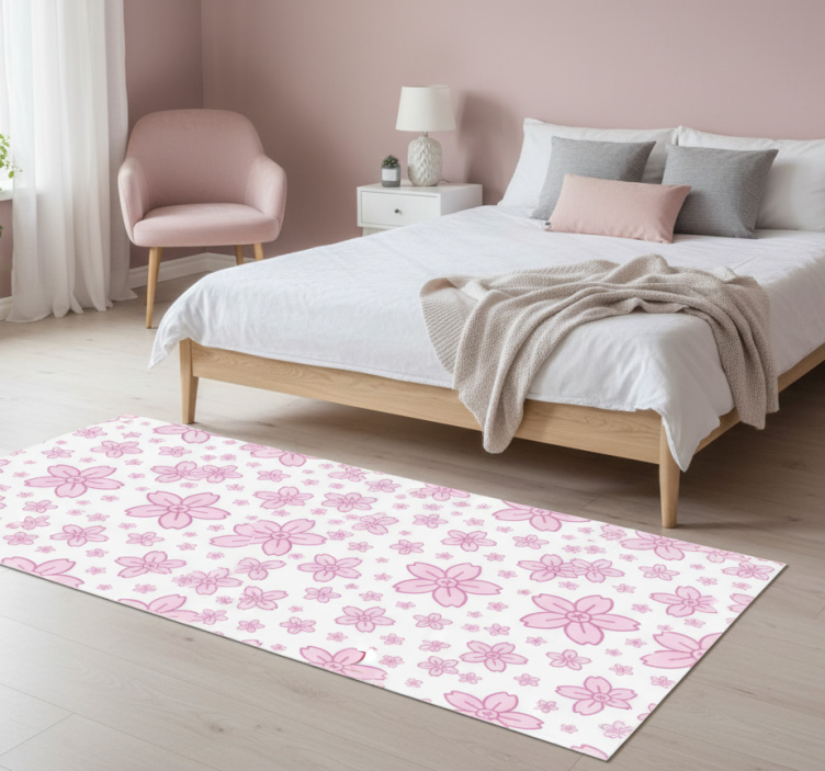 Bedroom vinyl rug with pink cute flowers on white