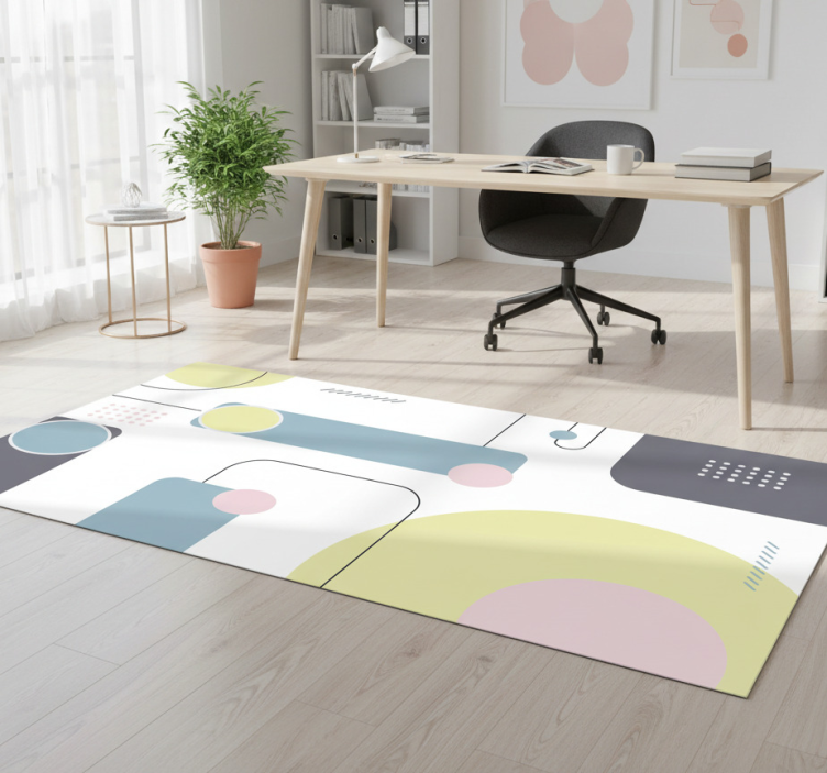 The Geometric vinyl rug in pastel geometric design is the ideal accent piece that brings warmth and charm to your living space! Its unique geometric shapes and soothing pastel colors create a visually appealing atmosphere that invites relaxation and creativity. Perfect for any room, this geometric vinyl rug effortlessly complements various interior styles, making it a must-have for anyone looking to elevate their home decor.