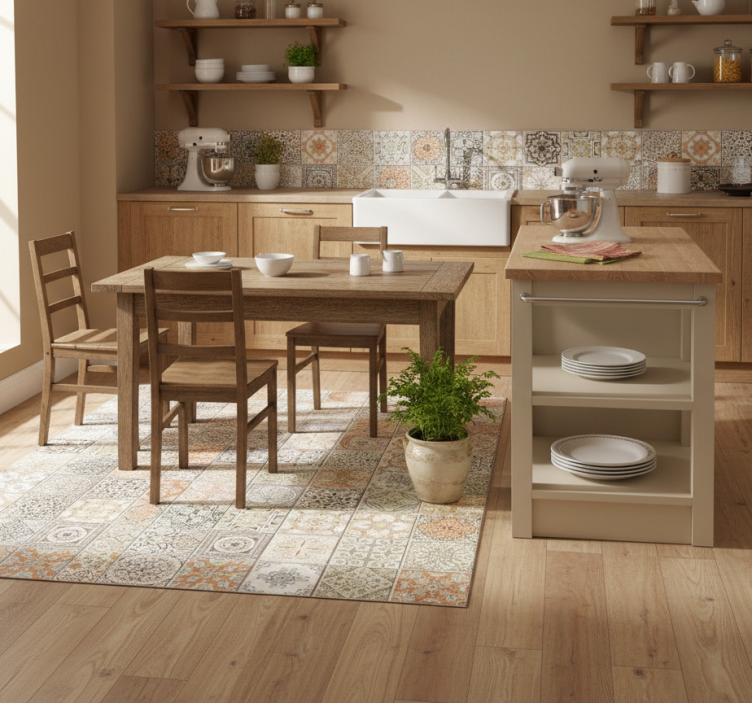 Reference: R19844Step into a world of nostalgic charm with our Vintage warm collage kitchen vinyl rug. This exquisite rug features a delightful blend of warm hues and a collage design that adds a unique character to your kitchen space. Its eye-catching graphics are sure to evoke a sense of warmth and homeliness, making it the perfect centerpiece for your culinary haven!