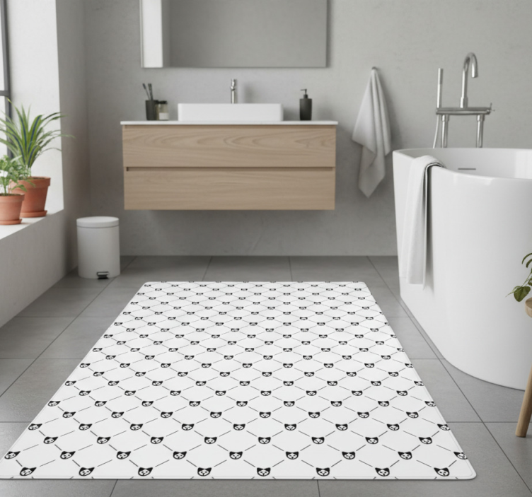 Reference: R23337Transform your space with our stunning Vinyl rug bathroom black and white dog pattern. This eye-catching design features a charming dog motif that beautifully complements its sleek black and white color scheme. Perfectly crafted to add a playful touch, the rug not only elevates your bathroom decor but also enhances the overall ambiance of your home.