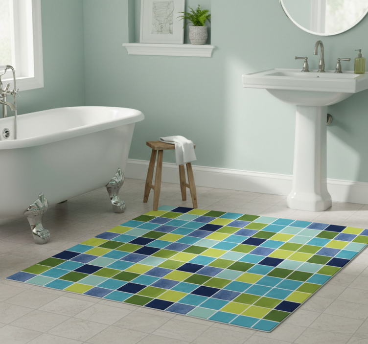 The Vinyl rug bathroom in blue and green tiles is not just a rug; it's a statement piece! Elevate your space with its unique design that brings life and color to your bathroom. This rug effortlessly enhances your decor, making it feel more inviting and stylish. With its visually appealing patterns, it encourages relaxation and complements various design themes, ensuring your bathroom looks stunning every day!