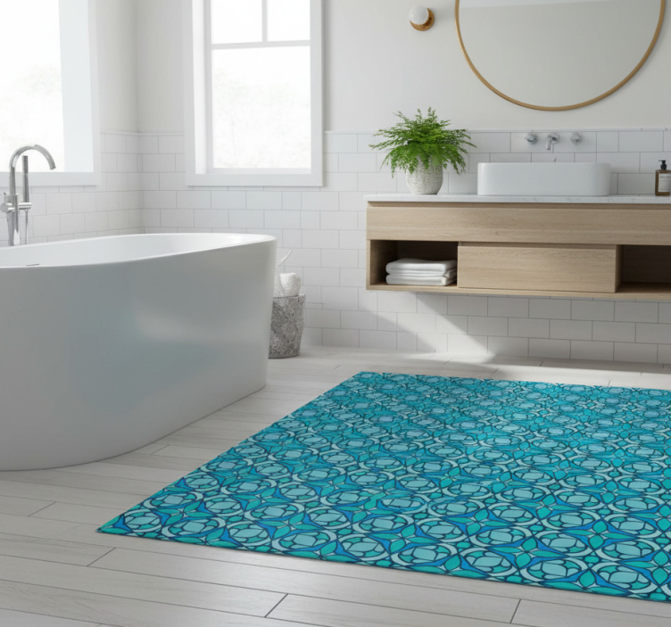 Reference: R23275Transform your bathroom into a stylish oasis with our Vinyl rug bathroom with blue wallpaper design. The mesmerizing blue patterns seamlessly blend with the wallpaper, creating a serene and captivating atmosphere. This unique rug not only enhances your decor but also provides a comfortable surface underfoot, making it the perfect addition to any bathroom.