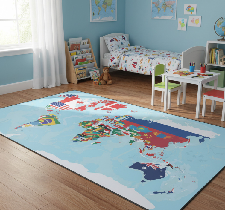 Keeping your World map vinyl rug with flags design looking fresh is a breeze! Simply wipe it down with a damp cloth or use a mild detergent for more stubborn stains. This world map vinyl rug is designed to withstand everyday wear and tear, ensuring it remains a cherished part of your home for years to come.