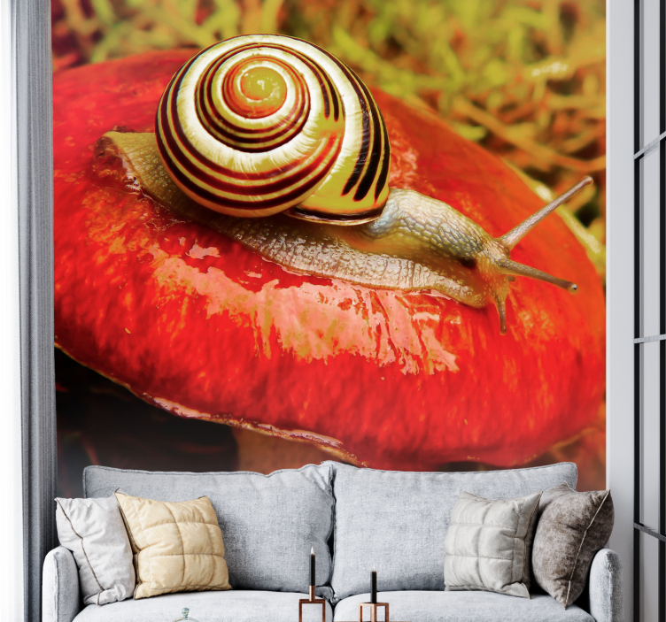 Transform your space with the enchanting Animal wall mural snail on mushroom. This design features a whimsical scene where a charming snail crawls atop a vibrant mushroom, beautifully capturing the essence of nature through stunning photography. The mural invites a fresh and playful atmosphere into any room, making it an ideal choice for nature lovers and those seeking a unique artistic touch!