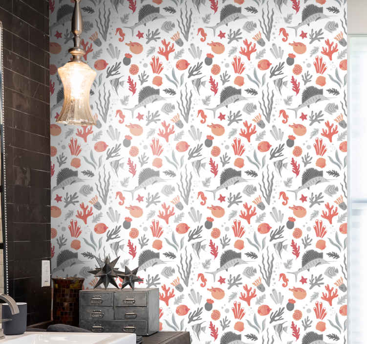 The underwater motif fish wallpaper features a stunning design with corals, undersea, sealife, pattern, illustration, marine life, seashells, starfish, coral, and seaweed. This captivating wallpaper brings the beauty of the ocean into any room, creating a serene and peaceful atmosphere. The vibrant colors and intricate details make it a perfect choice for anyone who loves the sea!